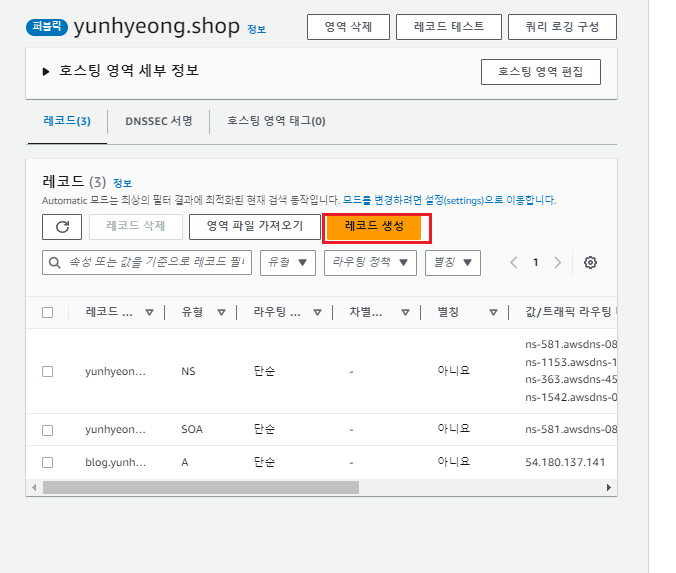 - 레코드 생성을 눌러 Route53 실습 때와 마찬가지로 ip주소를 적어주고 레코드 타입을 A레코드로 해준다.