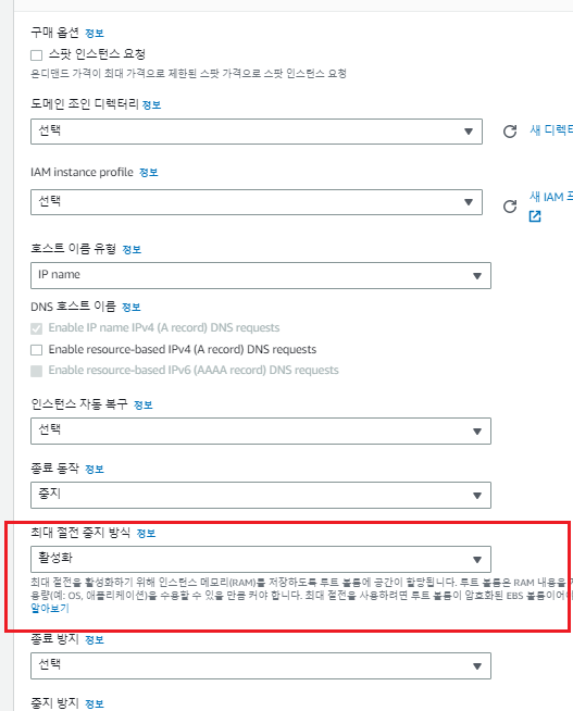- 최대절전 중지(실행하면 모든 프로세스가 동결되고, RAM의 콘텐츠를 EBS 루트 볼륨에 저장한 다음 일상적인 종료를 수행)모드를 활성화 한다.