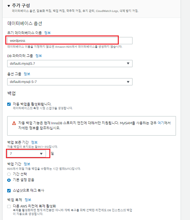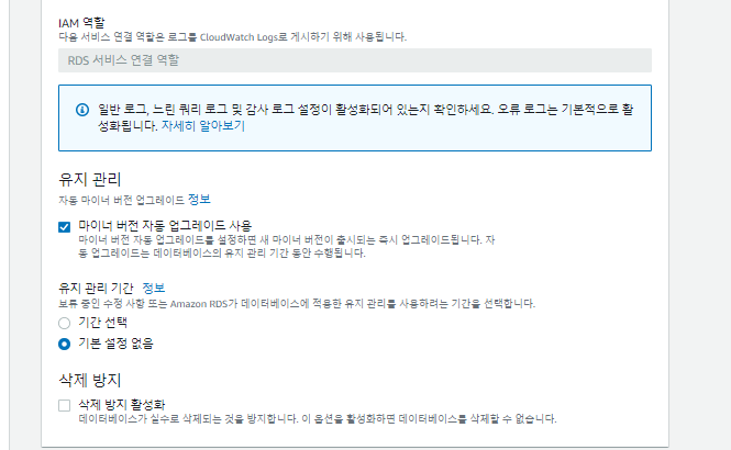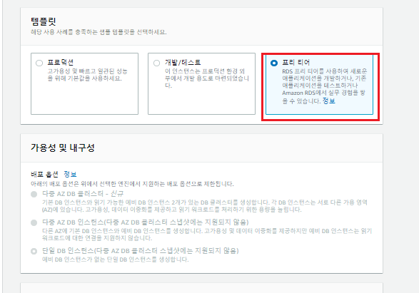 - 가용성 및 내구성 : 하나의 데이터베이스가 잘못되면 다른 데이터베이스로 옮기는 것 - 프리티어 템플릿 사용시비용 문제로 비활성화됨