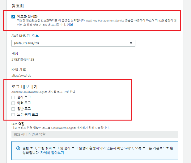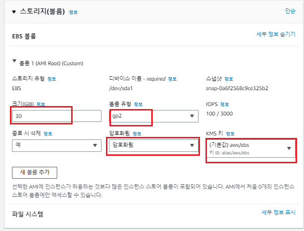 - 그리고 뒤에나오는 최대 절전 중지방식을 활성화 하기 위해서는 암호화가 필요하다 - KMS 서비스의 기본키를 활용하여 암호화를 한다.