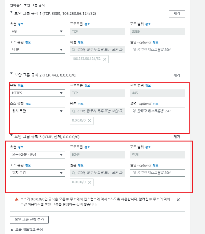- 그리고 HTTPS와 ICMP-all은 위치 무관으로 설정해 어디서든 해당포트로 접근이 가능하도록 만든다.