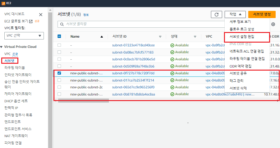 - 이를 해결하기 위해 VPC의 서브넷 부분에서 각 가용영역에서 설정 필요