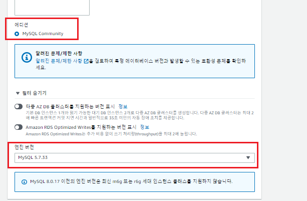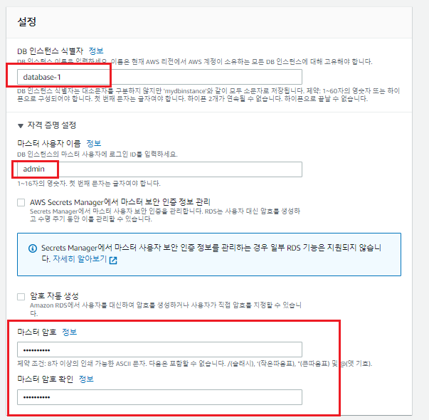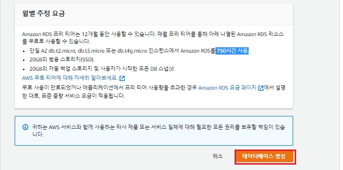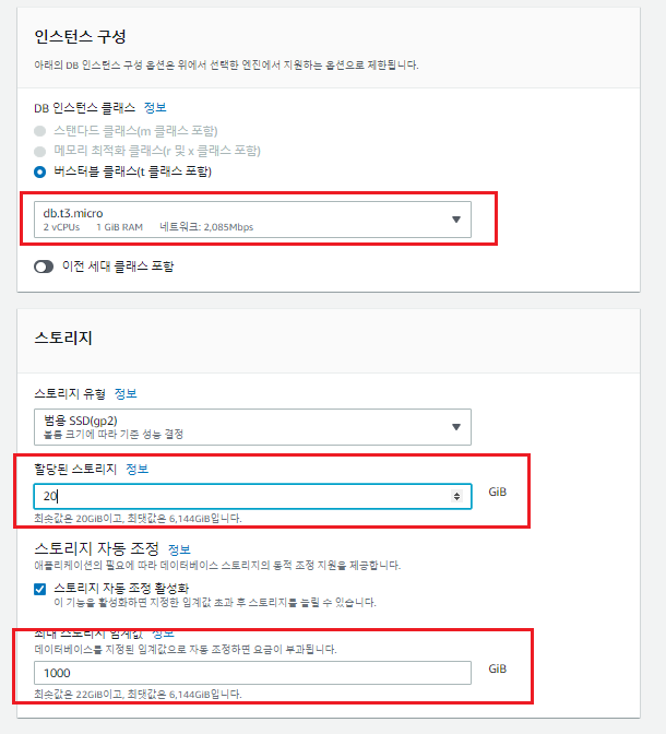 - 인스턴스는 db.t2.micro 와 db.t3.micro를 무료로 지원; 성능이 좋은 db.t3.micro 선택; 한달에 750시간 무료