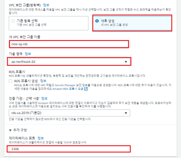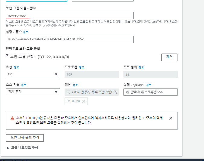 - 새 보안 그룹 생성 필요 : 웹서버가 2a 가용영역에 있기 떄문에 두 서버를 같이두면 가용영역 사용 불가시 두 서버다 이용 못할 수 있음