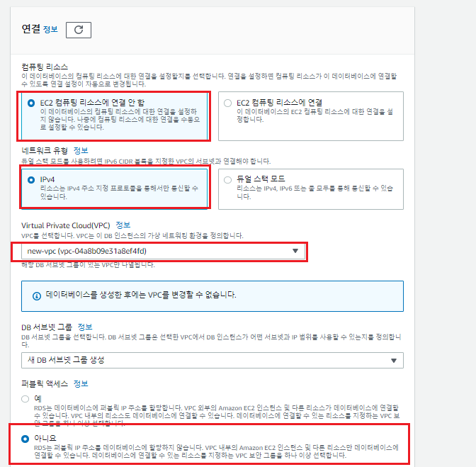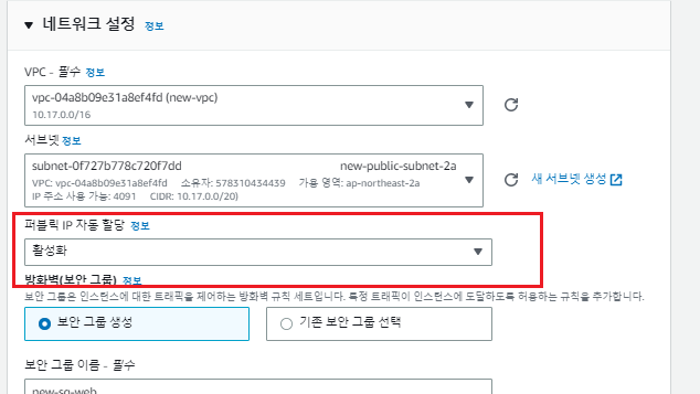 - 퍼블릭 IP 할당 부분이 새롭게 생성한 VPC를 활용하면 비활성화 되어있다