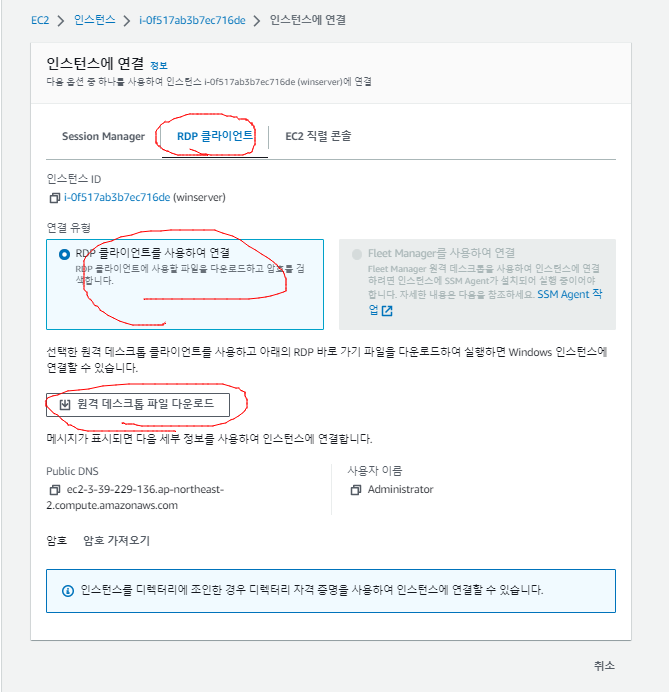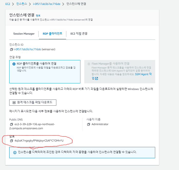 - 이후 암호 가져오기를 눌러 암호를 생성하고 원격 프로그램을 실행하여 원격으로 EC2에 연결한다.