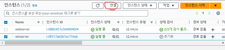 - 인스턴스 화면에서 winserver를 생성하고 연결 버튼을 누른다.