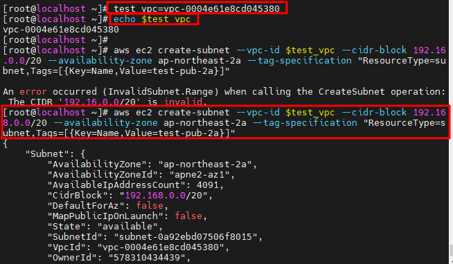 aws ec2 create-subnet --vpc-id $test_vpc --cidr-block 192.168.0.0/20 --availability-zone ap-northeast-2a --tag-specification "ResourceType=subnet,Tags=[{Key=Name,Value=test-pub-2a}]"