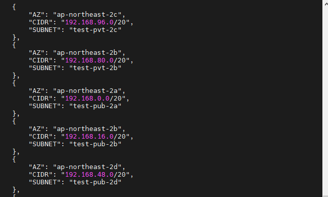 aws ec2 create-subnet --vpc-id $test_vpc --cidr-block 192.168.96.0/20 --availability-zone ap-northeast-2c --tag-specification "ResourceType=subnet,Tags=[{Key=Name,Value=test-pvt-2c}]"