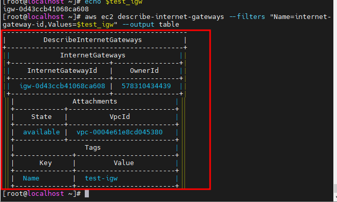 aws ec2 describe-internet-gateways --filters "Name=internet-gateway-id,Values=$test_igw" --output table