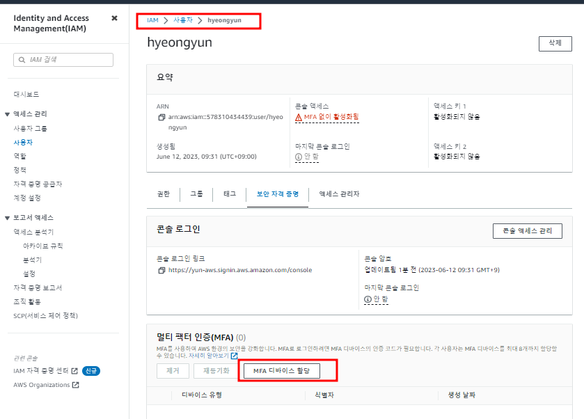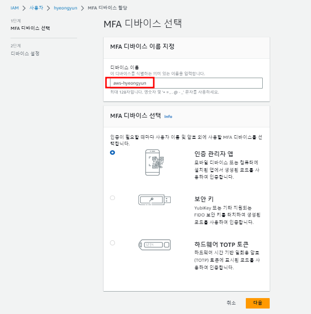 - 디바이스 이름 설정 후 MFA 코드 2개를 입력한다.
