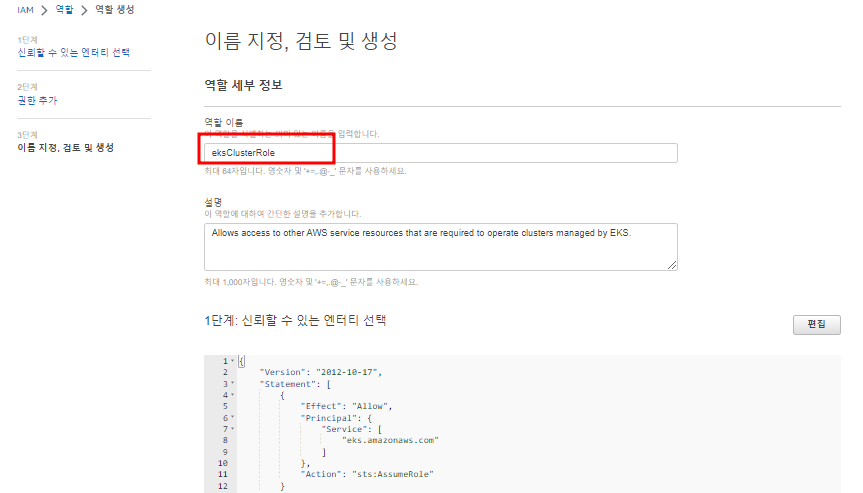 - 이름, 버전(최신), 이전에 생성한 역할을 지정한다.