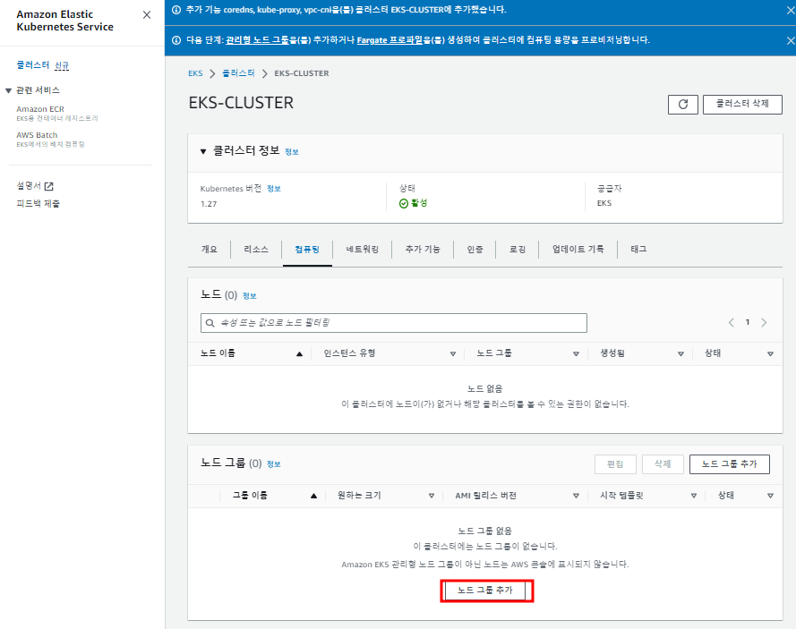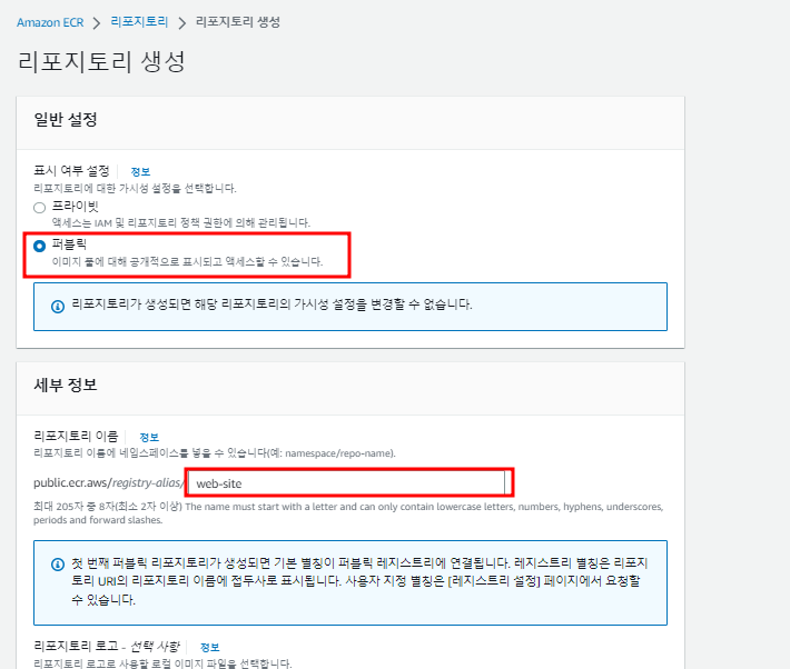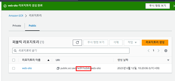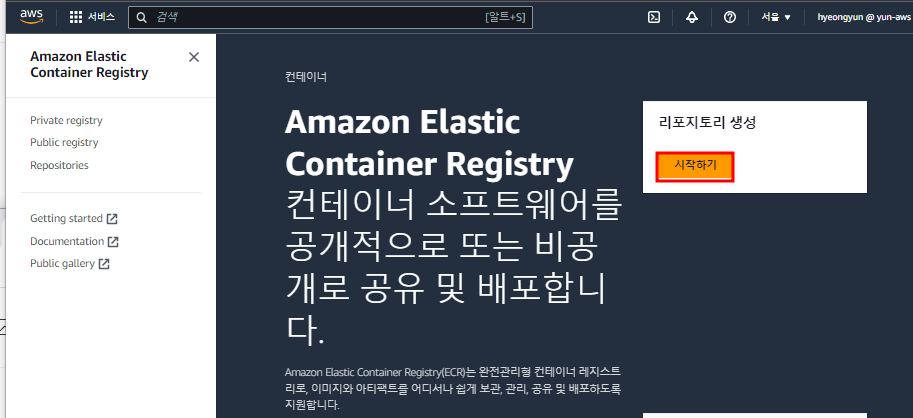 - eks 서비스에서 왼쪽에 ECR 버튼 클릭