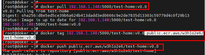 - 사설 레지스트리(192.168.1.148:5000)에서 test-home:v0.0 pull로 가져오고 tag 지정 후 ECR 레지스트리에 push