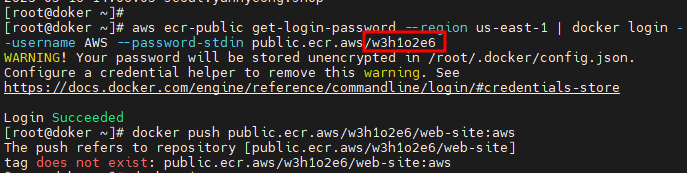 - ecr에서 생성한 레포지토리 주소로 tag를 만들고 푸시를 했지만 자격증명이 되어있지 않아서 실패