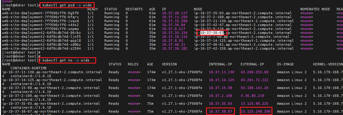 - externalIPs의 주소는 node의 내부 주소로 설정한다.(외부 트래픽이 node의 externalIP를 통과하여 pod에 접근하기 위해서는 clusterip 서비스의 외부 주소는 node의 내부주소로 설정해야한다.)