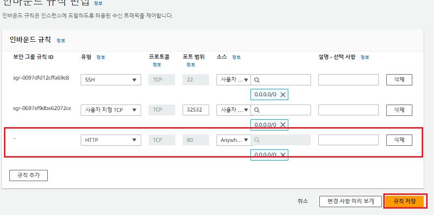 - 보안 그룹의 인바운드 포트 편집에서 모든 소스에대해 NodPort의 포트 번호를 허용한다.