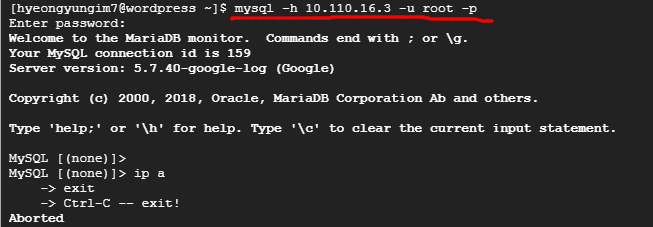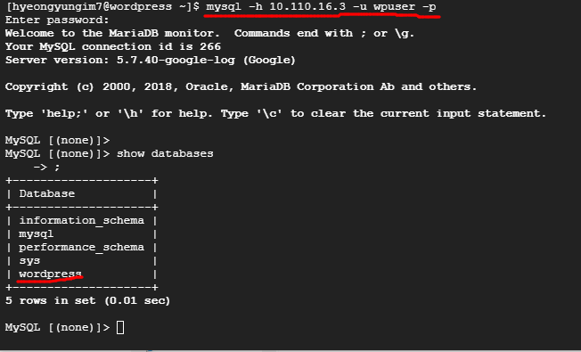 - 이번에는 이전에 등록한 wpuser 계정으로 DB서버에 접근한다