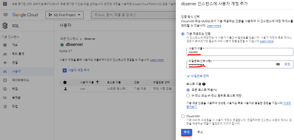 - DB 서버의 사용자를 만든다. (사용자이름 : wpuser, 비밀번호 : nwmc1023!!)
