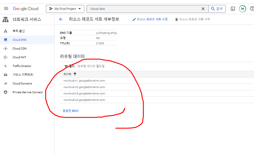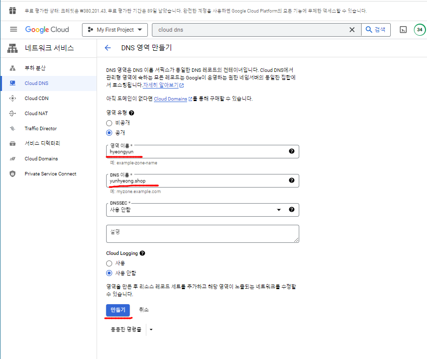 - 검색창에 cloud dns를 검색하고 영역 만들기 클릭
