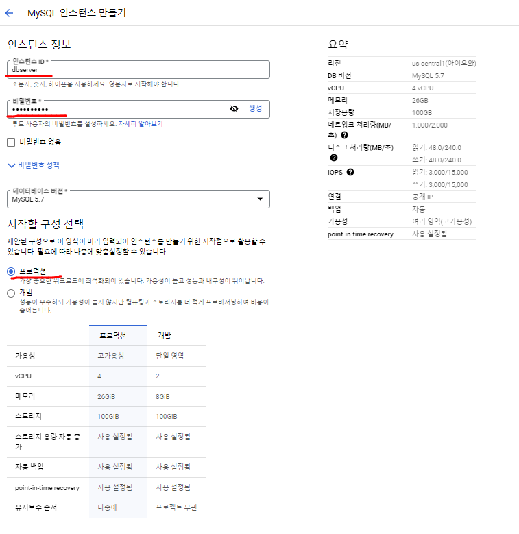 - 시작할 구성은 프로덕션으로 선택하여 VM의 스펙을 설정한다