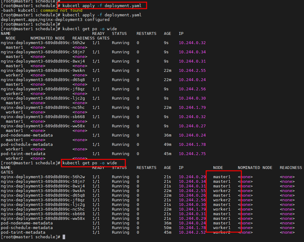 - pod-schedule2.yaml을 생성해서 다시 생성하면 worker1과 worker2에 pod가 생성된다.